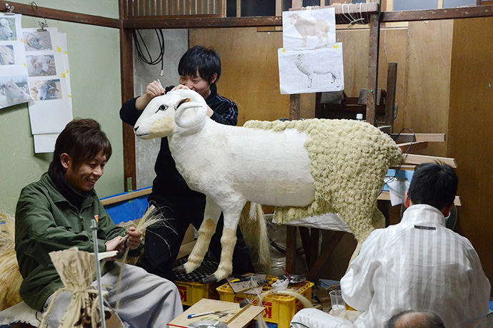 10代から70代まで、さまざまな年代が毎晩顔を突き合わせ、各町の特色を活かしたダシを作り上げます。五穀豊穣を願い、その年の干支をテーマに穀物や海産物などの食べ物を使うのが伝統ですが、「どんだけ綺麗に作っても、ムシ(干支の部分)が生きてなあかん」と言います。切干大根やスルメ、昆布などを張り付ける細かい作業を見ていると、少しずつ命が吹き込まれていくようでした。