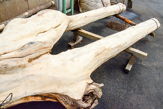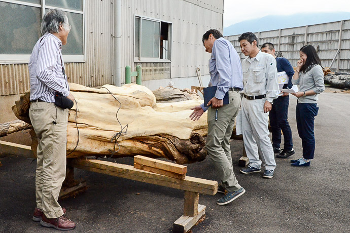 設計を担当してくださる建築史家・建築家の藤森照信先生と共に栗の木をもとめて長野県木曽町の山に入ってから約1カ月半、山から切り出された栗の木はお世話になっている、岐阜県の末永製作所にありました。