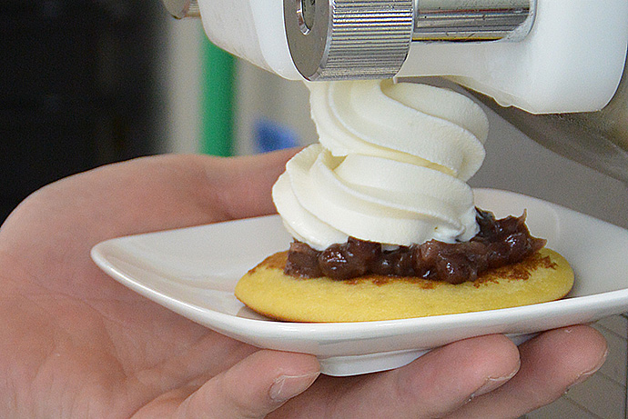卵たっぷりの生地に瑞々しい餡を挟んだ、たねやの「どらやき」はご存知ですか。 今、このどらやきの生地を使った「どらソフト」がラ コリーナ近江八幡のできたて工房で人気です。