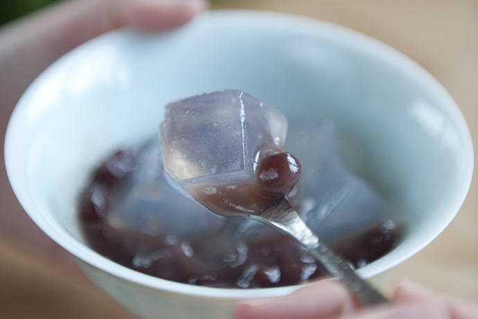口にほおばると心地よい食感でほろりとくずれ、瑞々しさを十分に感じられる少し大きめの寒天と、ほどよい甘さの小豆の風味が口中に広がりなんとも幸せな気分になり、夏の訪れを感じます。