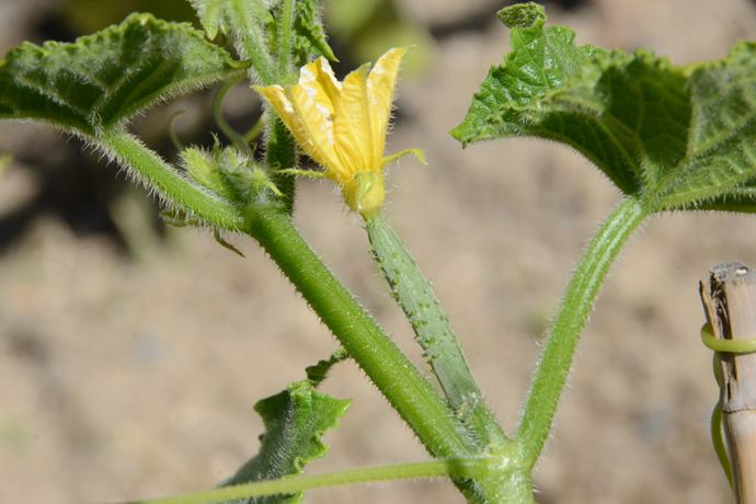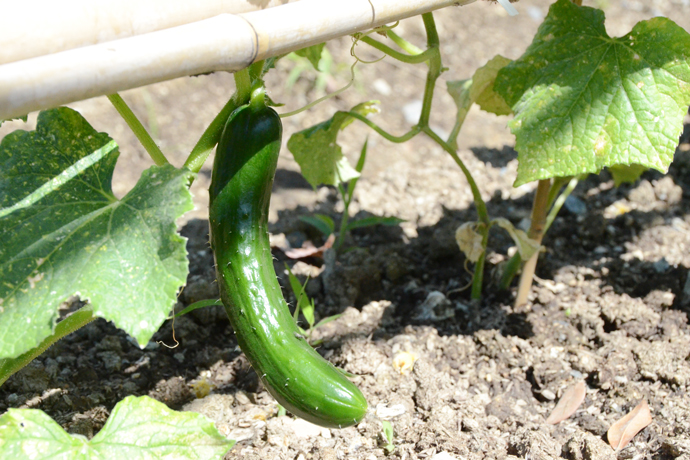 収穫前のキュウリはカラスに食べられてしまうこともあります。昨年からの改善として、畑全体の形に変化をもたせるなど工夫をしてきましたが、頭の良いカラスとの攻防は続きます。