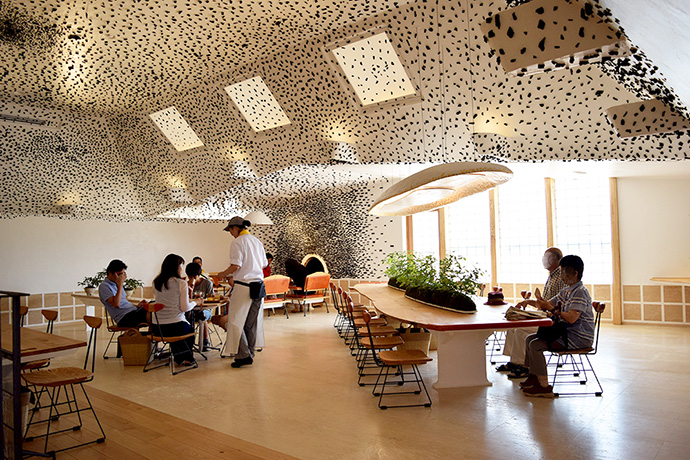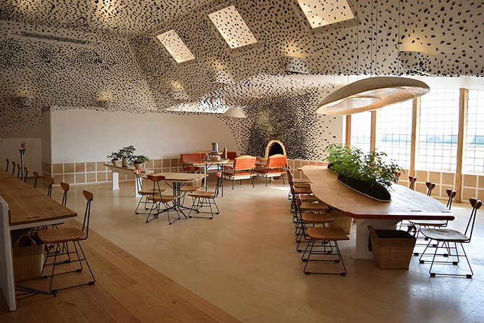 テーブルや椅子、照明、内装は全て藤森照信先生のデザイン。テーブルと椅子は古代から耐久性が強く重宝され、親しまれた栗材を使っており、自然のぬくもりを感じます。