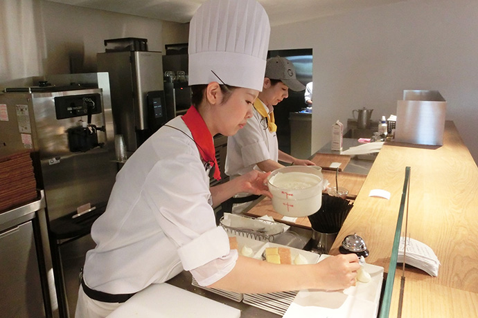 バームクーヘンをカットする様子も見られるカジュアルなフロアー。