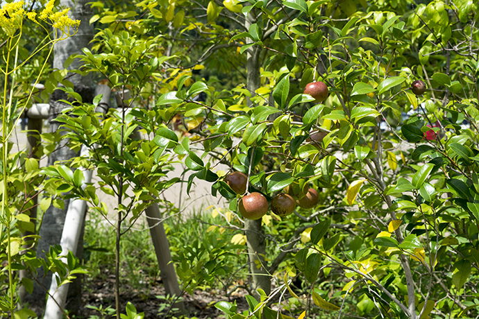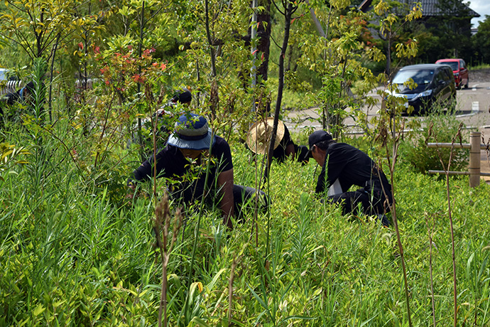 春に芽吹き、この夏に大きく成長した草花。 たねや農藝のスタッフは毎日観察し、それぞれの特性を見ながら手入れをします。 この夏の猛暑は作業をするのも一苦労。真っ黒に日焼けしたスタッフの傍らには水筒が並んでいます。