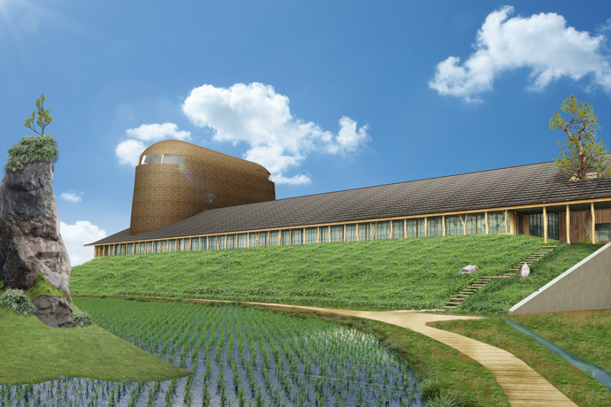 来春の完成予定に向け、着々と工事が進むたねやグループの新たな本社機能を備えた拠点「銅屋根」。