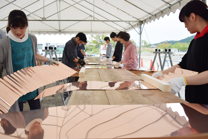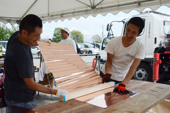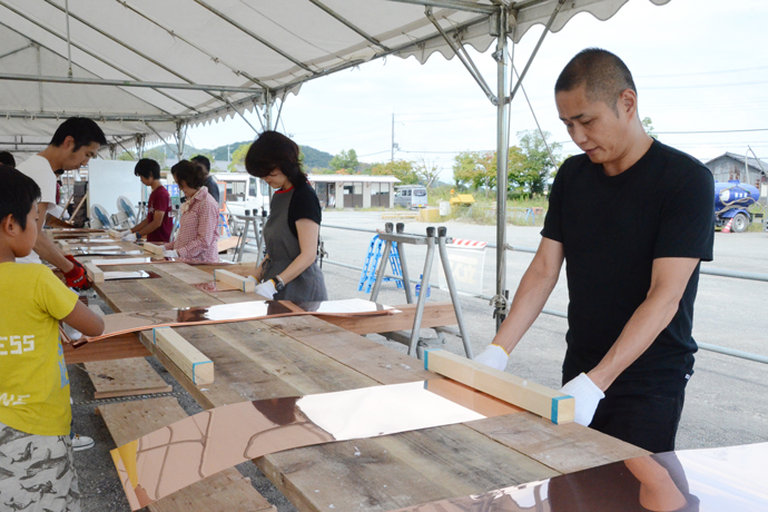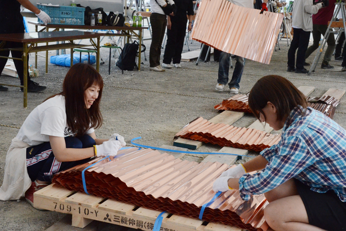夏の名残を感じる日差しとカラリと爽やかな風が吹いた9月12〜14日の3日間、ラ コリーナ近江八幡には、従業員から大学生までのべ100人以上が集い、5500枚、5.5トンもの銅板を曲げました。