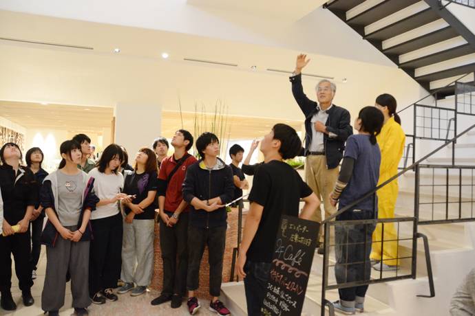 建築の勉強をする学生を前に、藤森先生自ら、ラ コリーナ近江八幡のメインショップ「草屋根」やたな田などを案内してくださる一コマも。