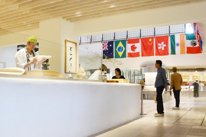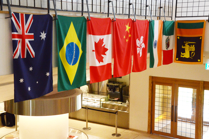 会場の1つとなるラ コリーナ近江八幡では、世界から集まる25人の若手リーダーたちへ歓迎の気持ちを込めて、メインショップに14カ国の国旗を掲げました。