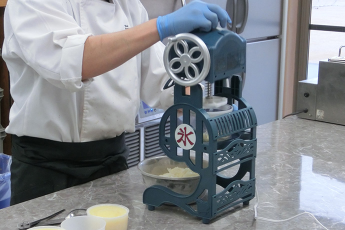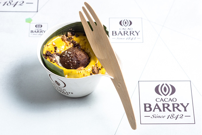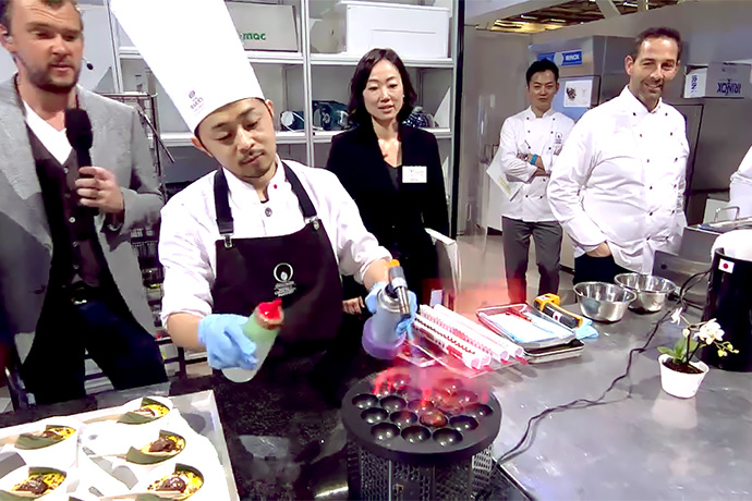 「スイートスナック オン ザ ゴー」はさっとつまんで歩きながら食べられるようなチョコレート菓子を製作します。ここで小野林は2つのサプライズを用意。 たこ焼き機でフォンダンショコラを作り、ラム酒をかけて炎を起こす演出。そしてその熱いフォンダンショコラ下にはアイスや、かき氷機で削った冷たいかき氷が。たこ焼き機とかき氷機で日本らしさを演出しました。