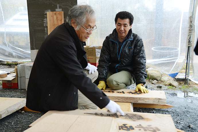 くっきりと浮かび上がった「山本德次書」の文字に、德次会長もほっとした表情。