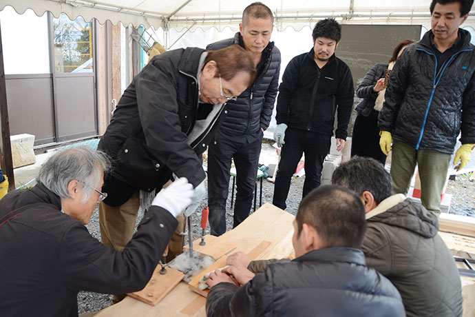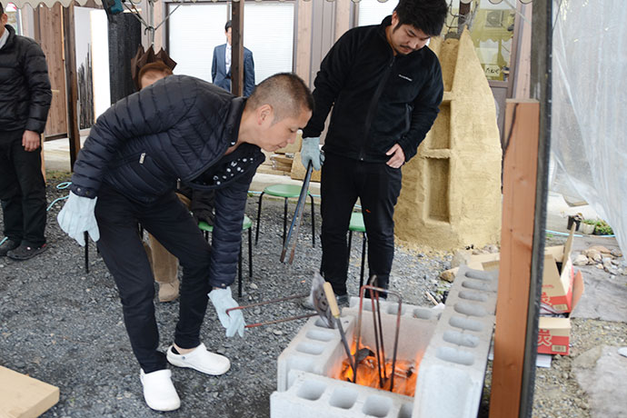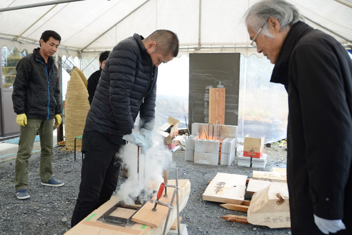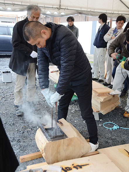 木が焼け、白い煙がもくもくと立ち上るなか、周りの者も固唾を飲んで見守ります。ほんの数秒押し当てた焼きゴテを外すと、そこにはくっきりとした「栗」の文字が!思わず拍手と歓声が起こりました。