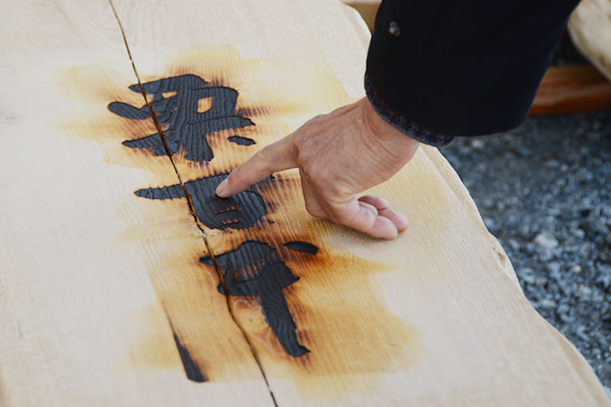 先月、栗の木の柱に「栗百本」という文字の焼印を入れました。この字は山本德次会長による書。