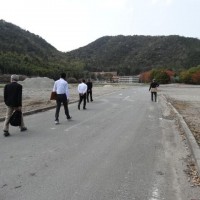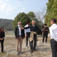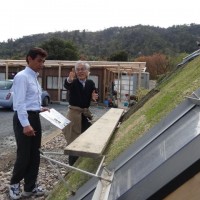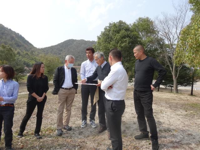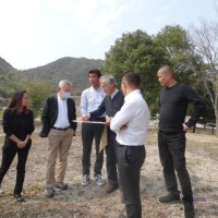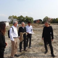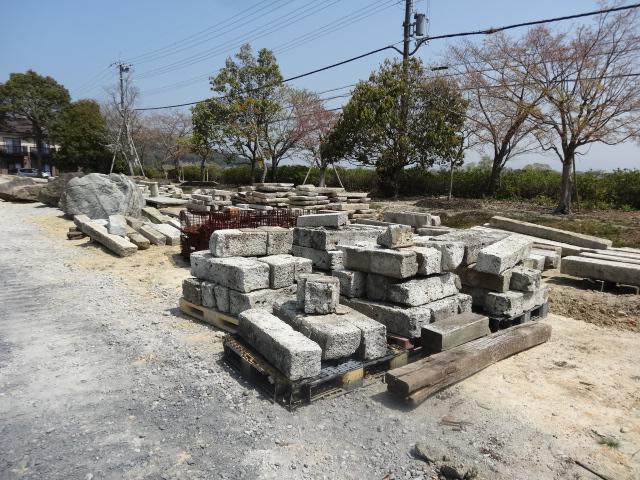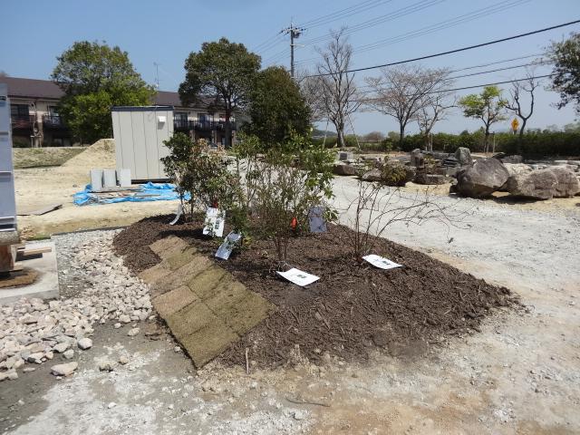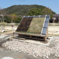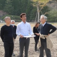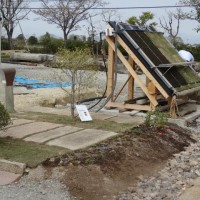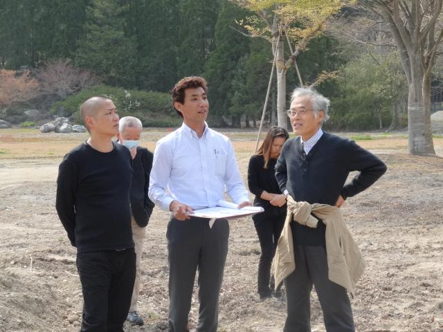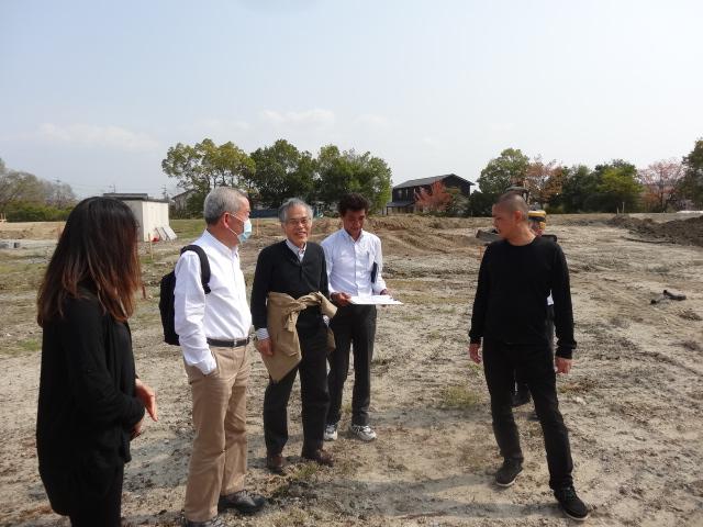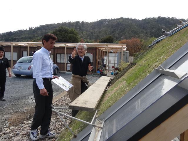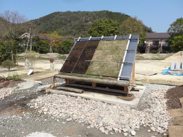 駐車場歩道まわりの植栽を検討。草屋根の施工方法についても、種から蒔くものと、芝をはるものなど、試行錯誤を重ねています。公道からのエントランスに用いる石も搬入。敷地を歩き、草屋根の建つ場所の確認も。