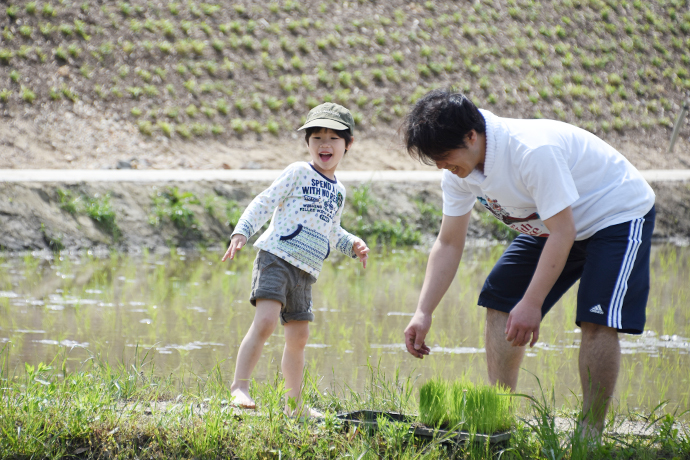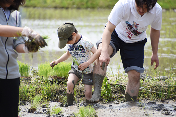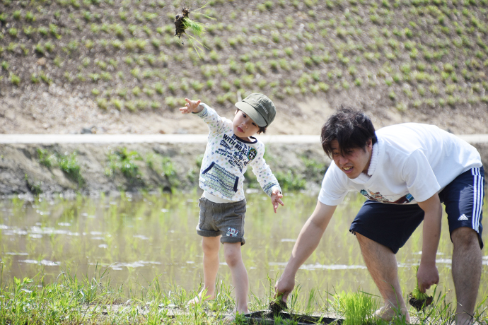お父さんに教えてもらいながら、しっかりと苗を届けられたようです。次の順番が来ると田植えにも挑戦し、とても上手に植えていました。