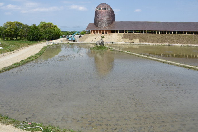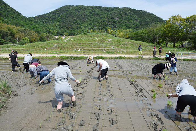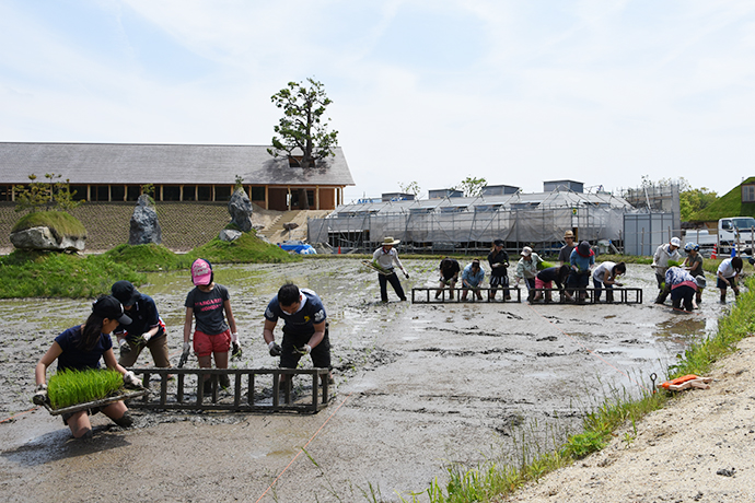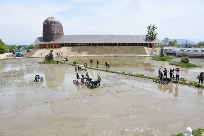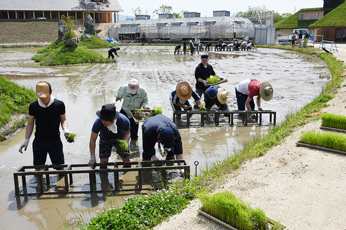 5月15日、ぽかぽか陽気の太陽の下、緑いっぱいのラ コリーナ近江八幡で2日目の田植えが行われました。