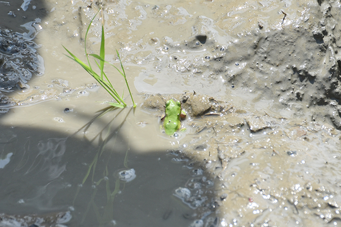 息を合わせて「せーの」と木枠をころがしていくと、アメンボやオタマジャクシ、カエルなど色々な生物にも出会えました。