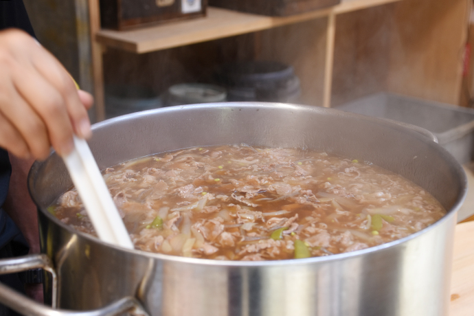昼食はバームクーヘン工場のみなさんが牛丼を用意して下さっていました。デザートには、クラブハリエのバームクーヘンに杏仁豆腐と盛りだくさん。
