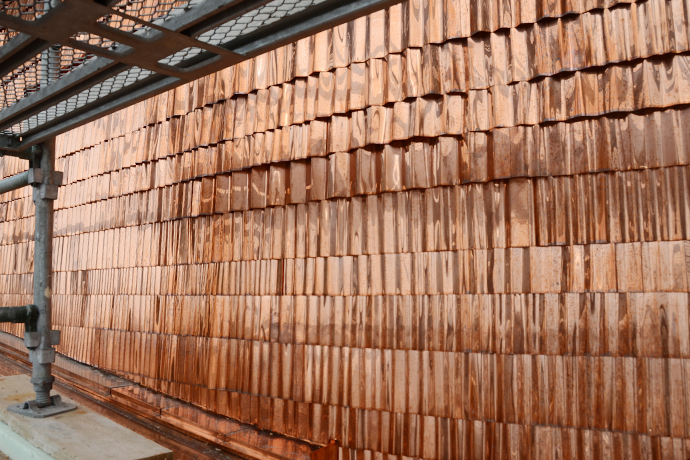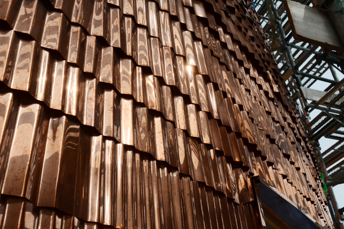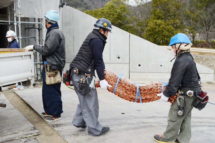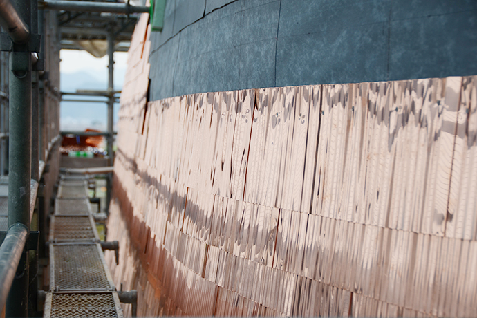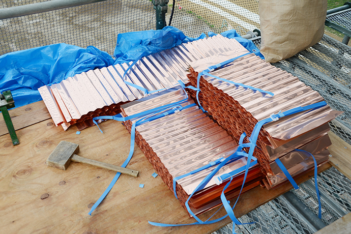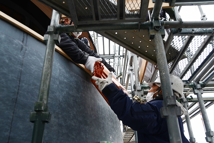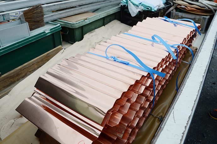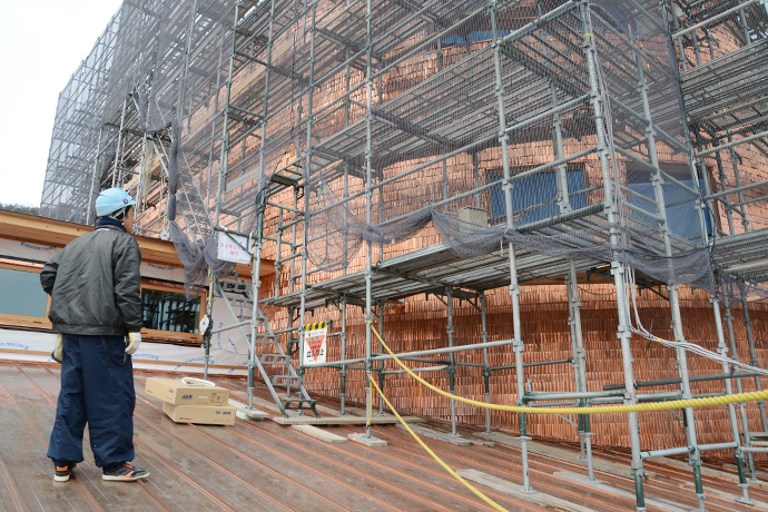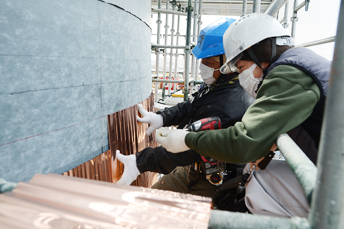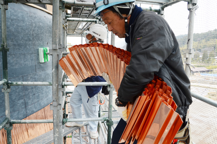 新たな本社の建築名は「銅屋根(どうやね)」といいます。 建築家・建築史家の藤森照信先生の設計によるその建物の屋根は、名前の通り、銅板で葺かれています。 この銅板は、私たち従業員自らの手で波型に曲げたもの。藤森先生やたねやグループ社長の山本、大学生のみなさんも参加し、5500枚もの銅板をすべて手作業で曲げました。その時の様子はこちら。 巨大な楕円形の球面を葺くのは、とても難しいのだとか。この日は、板金職人さんが塔上部の作業にあたっていました。見た目以上にずっしり重たい銅板を運び上げると、カーブに合わせて8種類の大きさの銅板を使い分け、一枚一枚固定していきます。 足場から下を見下ろすと、ドキッとするような高さ。しっかりと安全帯は装着しているものの、終始気の抜けない雰囲気のなか次々と銅板を吹き上げていく職人技が光っていました。 全て葺いた後は銅板の先を曲げて跳ね上げる作業が続きます。とても手間のかかる作業ですが、これが時を経るごとに変化し、色を変える「銅屋根」の“味”となります。 こうして、たくさんの人たちの手を介して、「銅屋根」は形作られていきました。