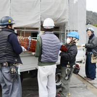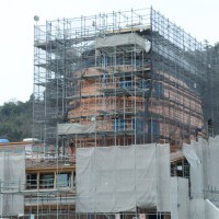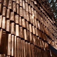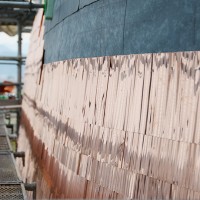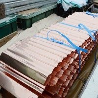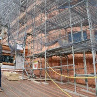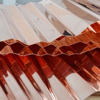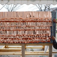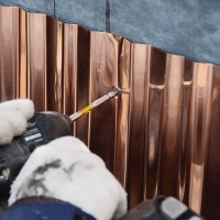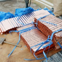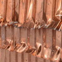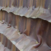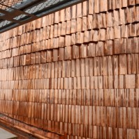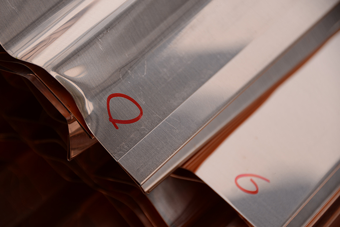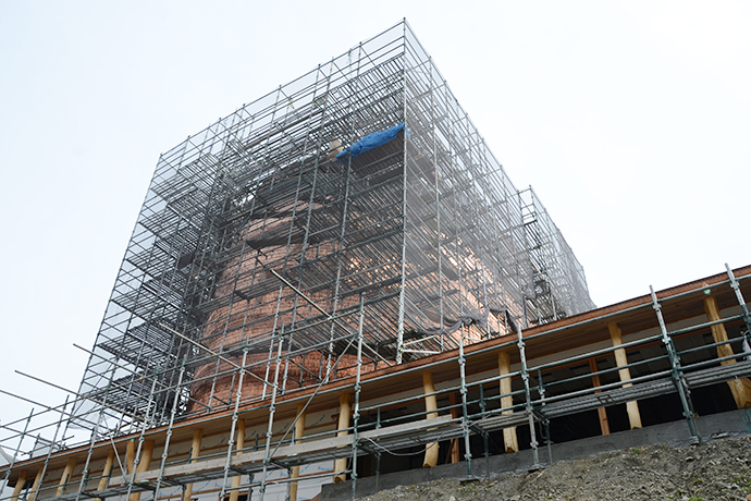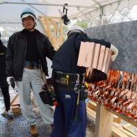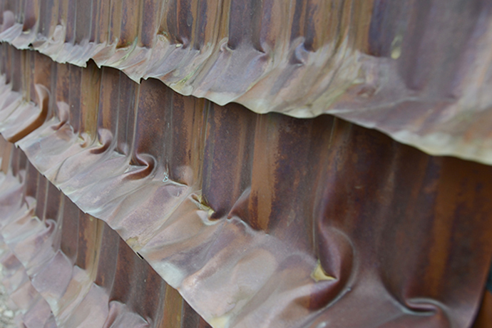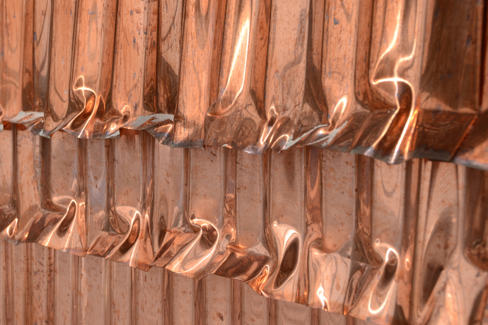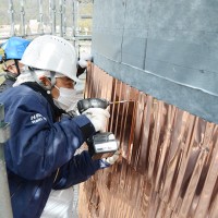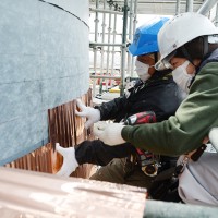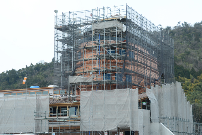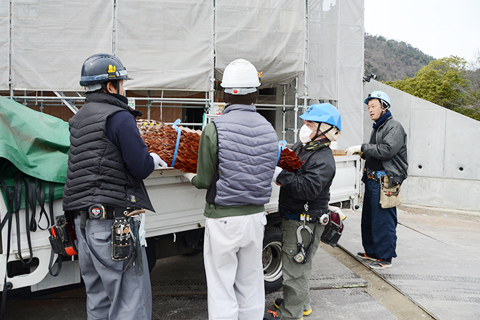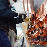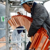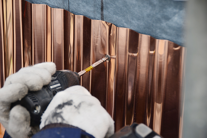 新たな本社の建築名は「銅屋根(どうやね)」といいます。 建築家・建築史家の藤森照信先生の設計によるその建物の屋根は、名前の通り、銅板で葺かれています。 この銅板は、私たち従業員自らの手で波型に曲げたもの。藤森先生やたねやグループ社長の山本、大学生のみなさんも参加し、5500枚もの銅板をすべて手作業で曲げました。その時の様子はこちら。 巨大な楕円形の球面を葺くのは、とても難しいのだとか。この日は、板金職人さんが塔上部の作業にあたっていました。見た目以上にずっしり重たい銅板を運び上げると、カーブに合わせて8種類の大きさの銅板を使い分け、一枚一枚固定していきます。 足場から下を見下ろすと、ドキッとするような高さ。しっかりと安全帯は装着しているものの、終始気の抜けない雰囲気のなか次々と銅板を吹き上げていく職人技が光っていました。 全て葺いた後は銅板の先を曲げて跳ね上げる作業が続きます。とても手間のかかる作業ですが、これが時を経るごとに変化し、色を変える「銅屋根」の“味”となります。 こうして、たくさんの人たちの手を介して、「銅屋根」は形作られていきました。