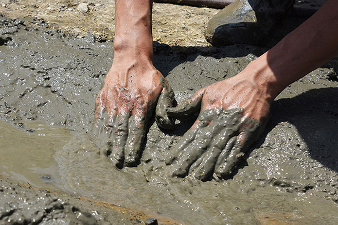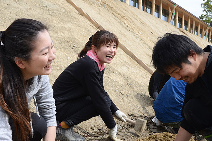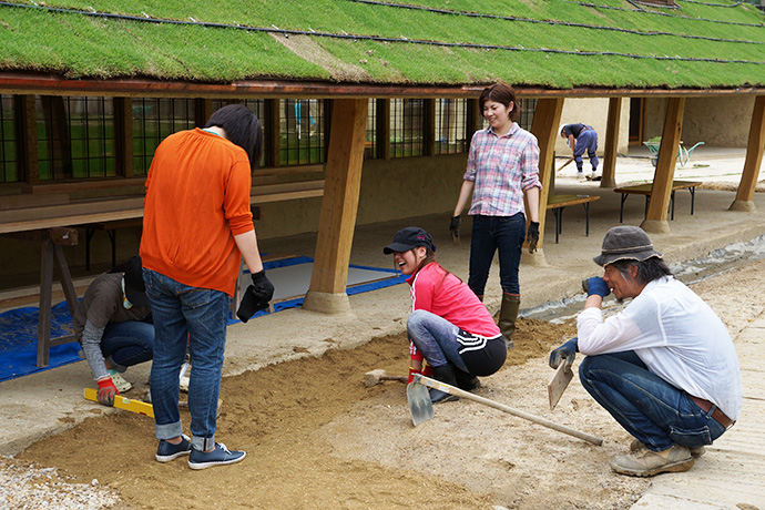 川づくりは4月の終わり頃から始まりました。4月といえども、すでに太陽が元気に明るく照らしている中での作業です。蒲生(がもう)の土などを混ぜたものを踏み固め、木づちで叩いていきます。