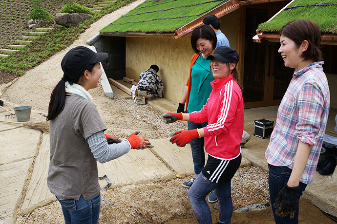話も盛り上がりつつ、作業もどんどん進んでいきます。ランドスケープを担当してくださっている重野国彦さんも「良い仕事できてるね!」と感心のご様子。今回、田んぼのふちに水の流れを作ろうと、何気ない小川ですが、実は細かく計算して設計されています。たくさんの人たちが関わって、形になっていく様子を見ているとワクワクします。