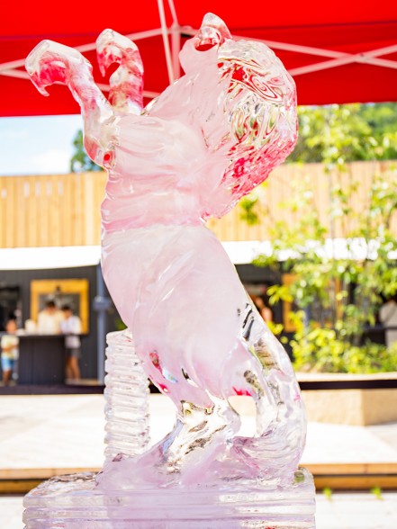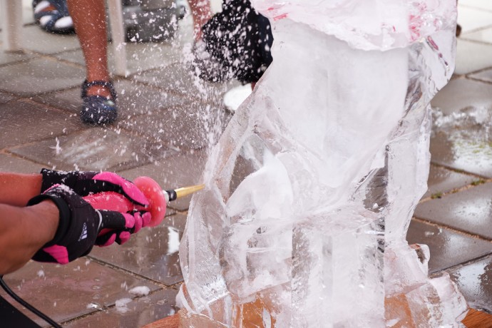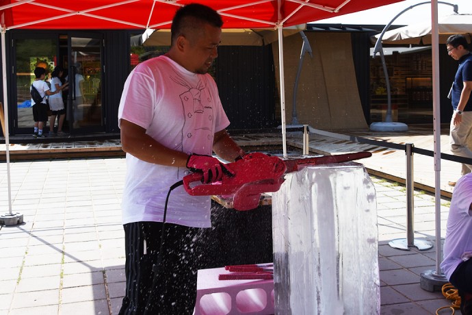 食べるだけではなく、見た目にも涼しさを感じていただければと思い、クラブハリエ社長山本隆夫や若手パティシエらによる氷の彫刻のデモンストレーションを何日かに分けて行いました。コンテナショップが挑戦の場という事もあり、日々練習している技を披露する事に。ノコギリやノミなどを使い、大きな氷の塊を削ったり掘ったりして形を作っていきます。