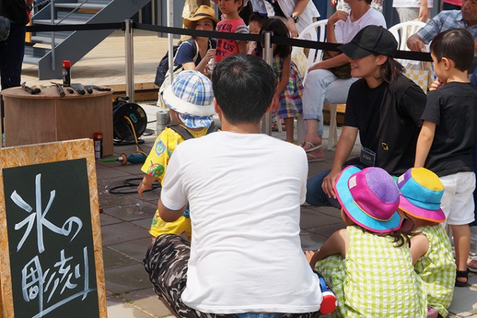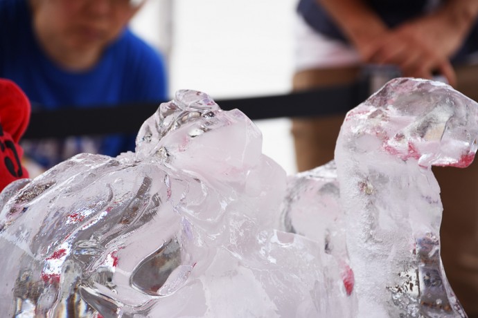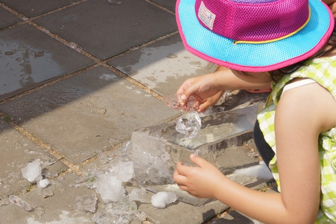 普段なかなか見る機会のない氷の彫刻に大人も子どもも興味津々。子どもたちは氷のかけらを手に取って、冷たさも楽しんでいました。