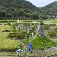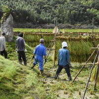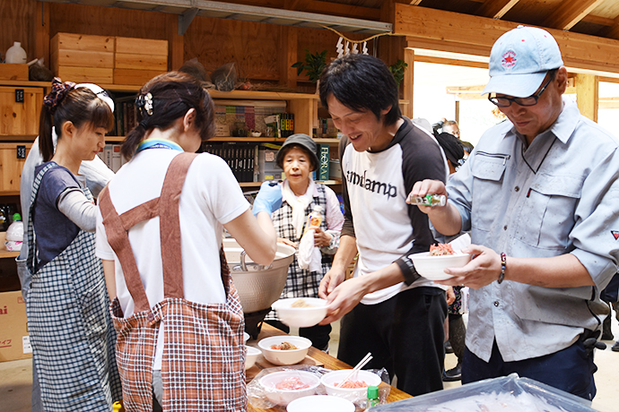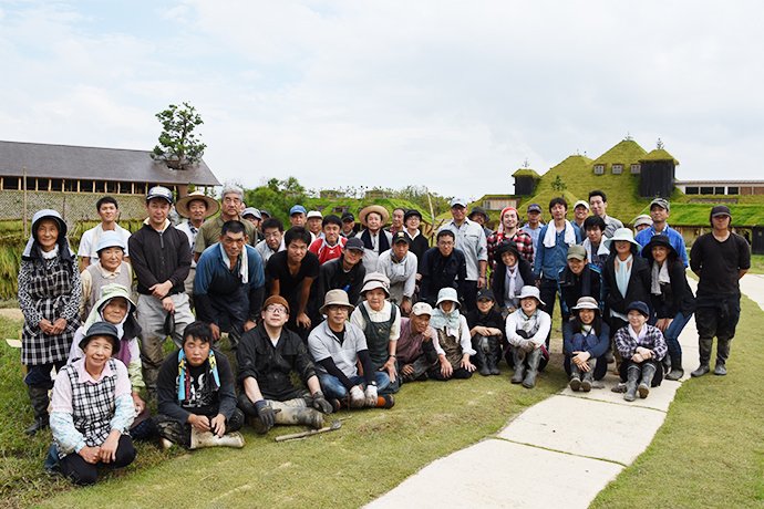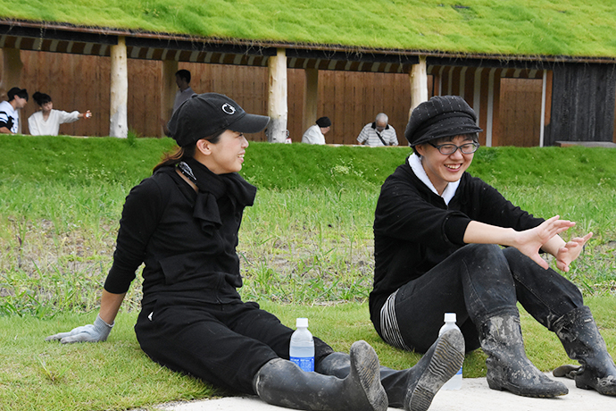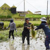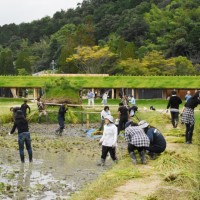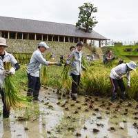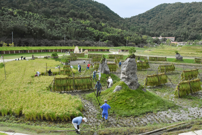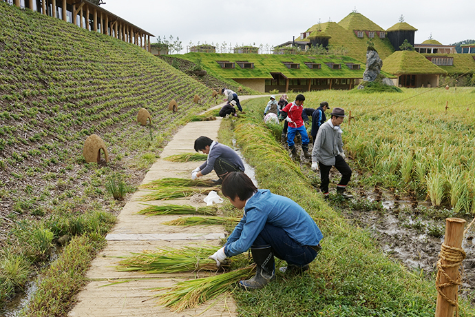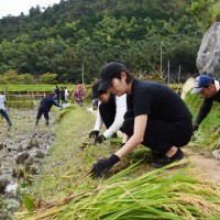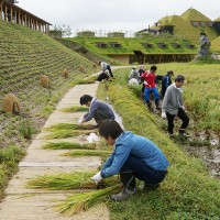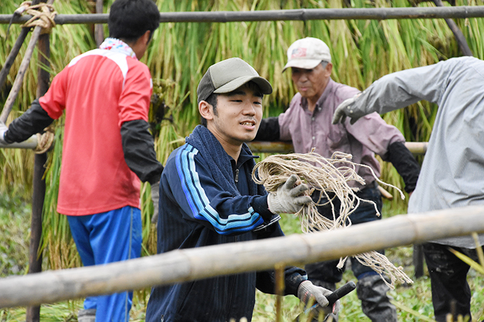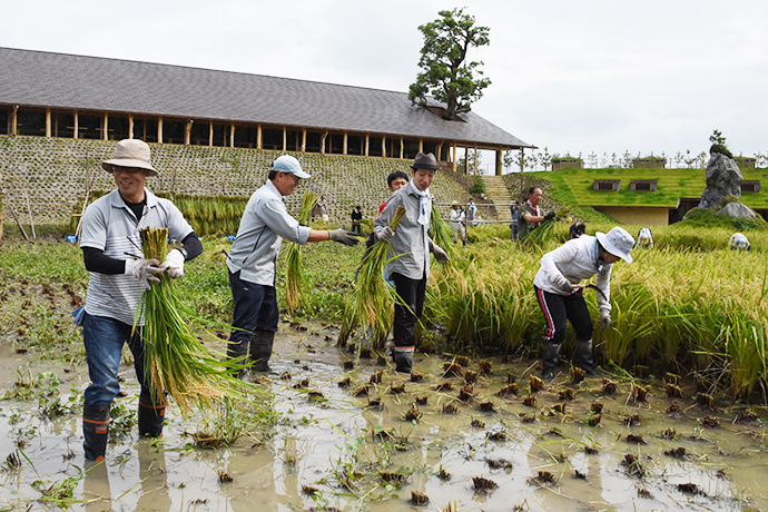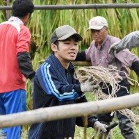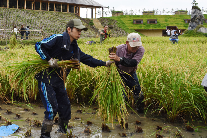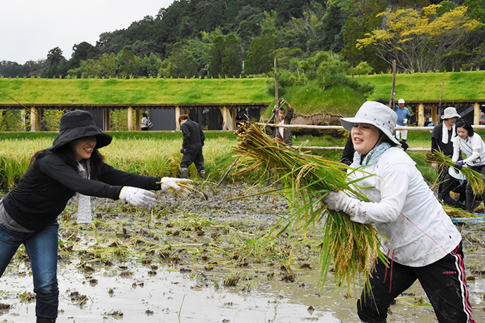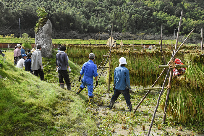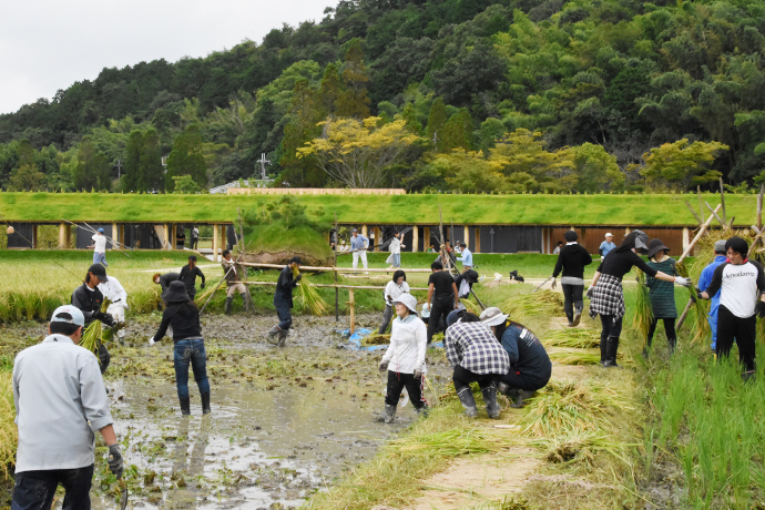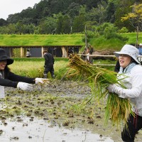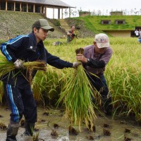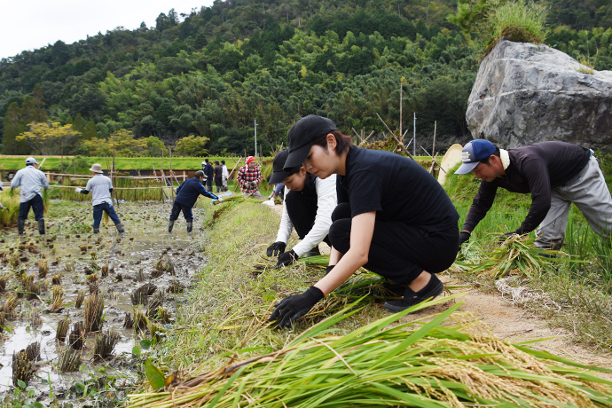 9月26日に行った2日目の稲刈りでは、「日本晴れ」という種類のお米を刈り取りました。 前日から降り続いた雨のため田んぼに水がたまり、足場が悪い中での作業にスタッフ一同悪戦苦闘! せっかくのお米を泥で汚さないように…みんなで息を合わせて稲をリレーし、協力して頑張りました!