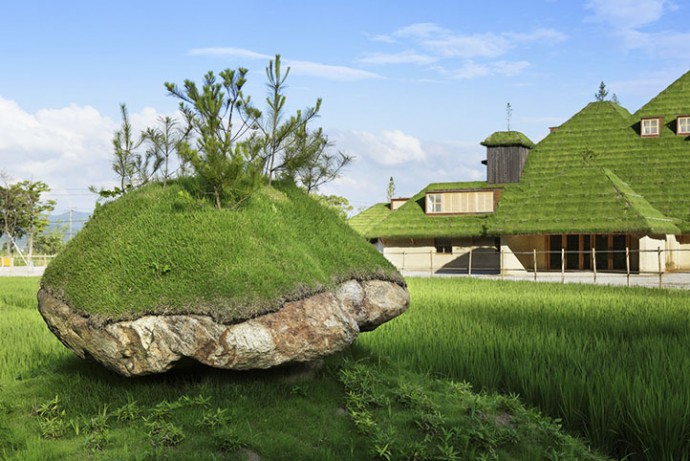 〈七つ石〉にはひとつずつ名前があります。シンボルツリーの楠(クスノキ)の近くにある夫婦石の「徳石(とくいし)」「有石(ありいし)」、そして田んぼの中の「蓬莱山(ほうらいさん)」「おにぎり石」「舟石(ふないし)」「田津石(たづいし)」そしてハチマキをしている様に見える「鉢まき石」。それぞれの名前は藤森照信先生が命名されました。