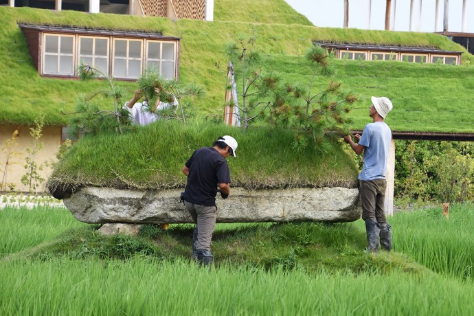 藤森先生とランドスケープ担当の重野国彦さん指導のもと、石の上に苔山を作り、キジムシロやコグマザサなどの植物を植え、藤森先生が自ら選ばれた松の木を植えました。担当したのは、たねや農藝 ラ コリーナ近江八幡造園の奥野一成さんと森嵜一誠君。石の上に土を盛ったり、松の水やりのしかけなどたくさん試行錯誤して完成した時の嬉しさはひとしおでした。