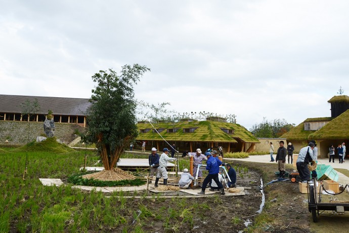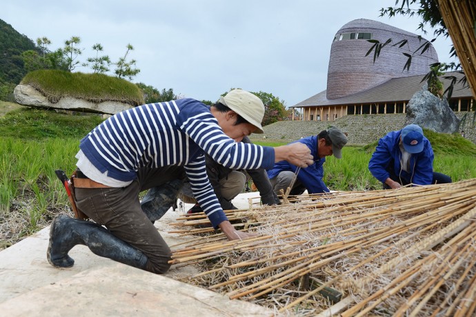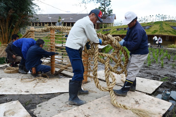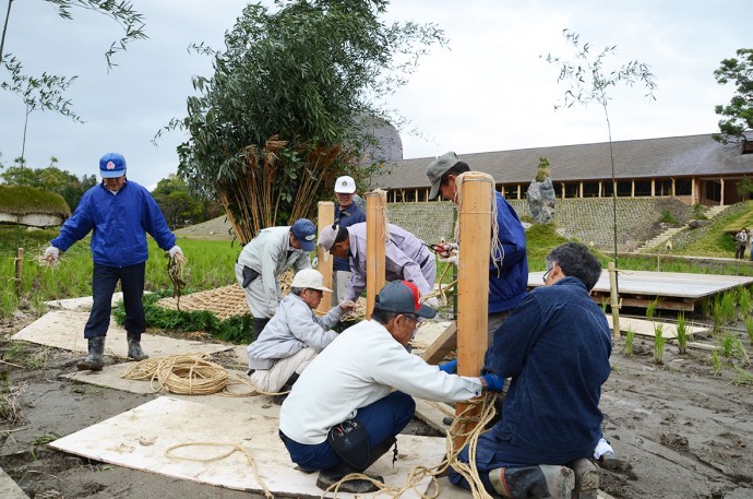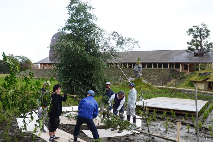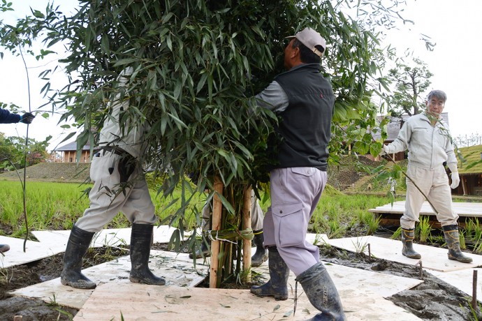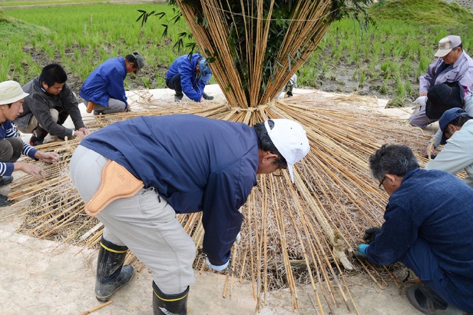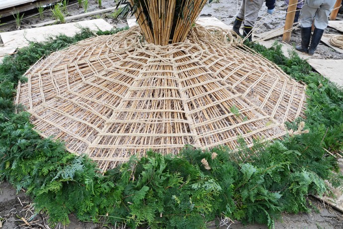青竹の周りに常緑の雑木(この日はモミジやサカキなど様々な木々が使われていました!)、足元には菜種ガラをしいてヨシを放射線状に配置していきます。