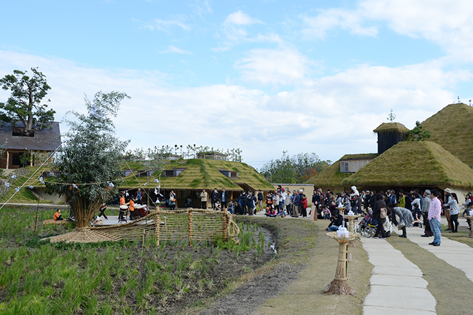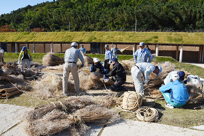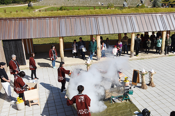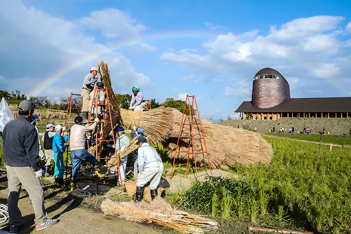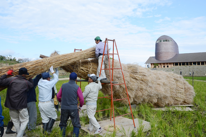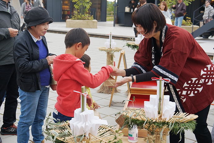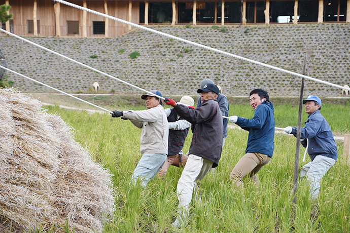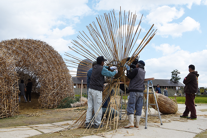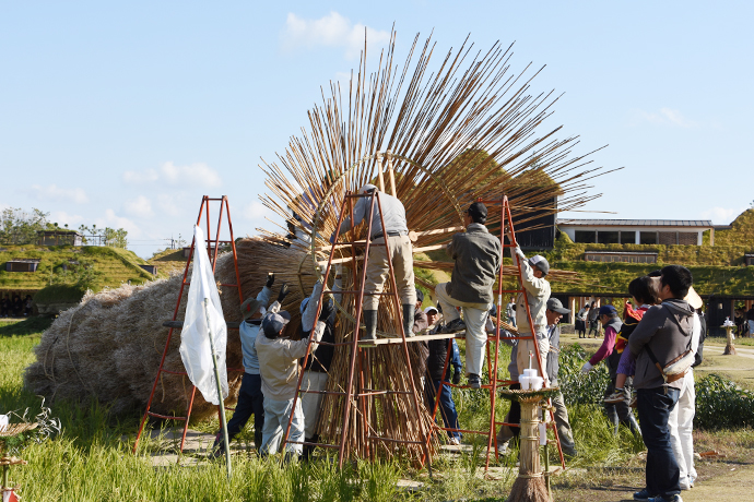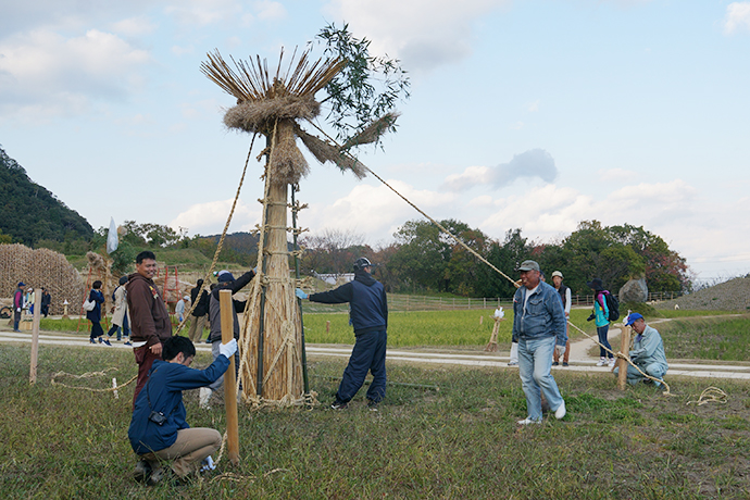 そして、今日一番の見どころは2基の大松明の設置。大きな松明が全てヨシやワラ、菜種ガラなどの自然の素材でつくられ、人の手で立てられてゆく様子は迫力満点でした!訪れたお客さまも興味深そうに見物されていました。