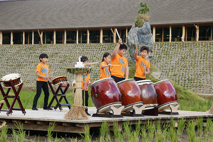 田んぼの中の特設ステージでは地元の子どもたちによる「日牟禮太鼓」の和太鼓演奏が披露されました。