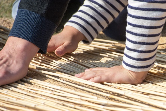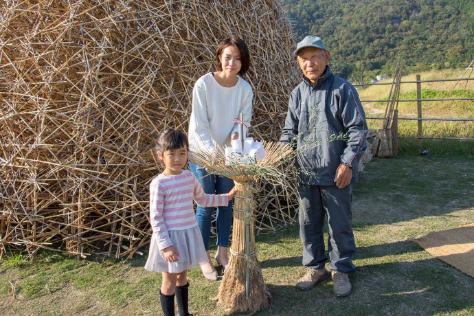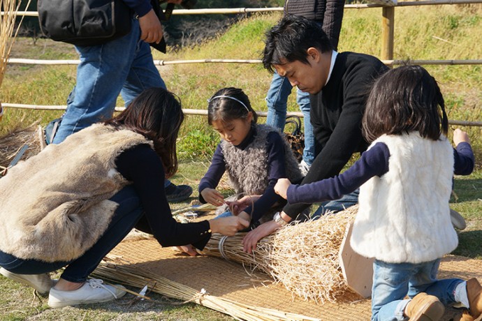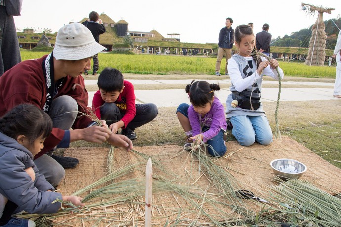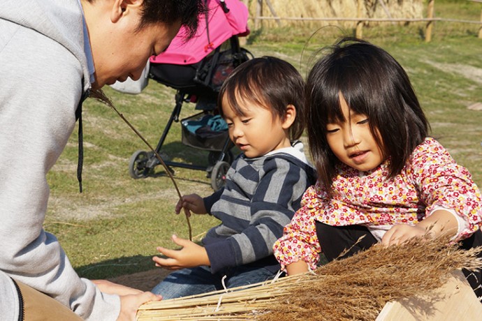 子ども松明づくりのワークショップでは、当日飛び入りで参加してくださった方もいました。子ども松明は、子どもの成長を願って作られる小さな松明。作る様子を見ていらした方の中には、「しめ縄、こうやって作ってたね」と懐かしそうにお話される方も。