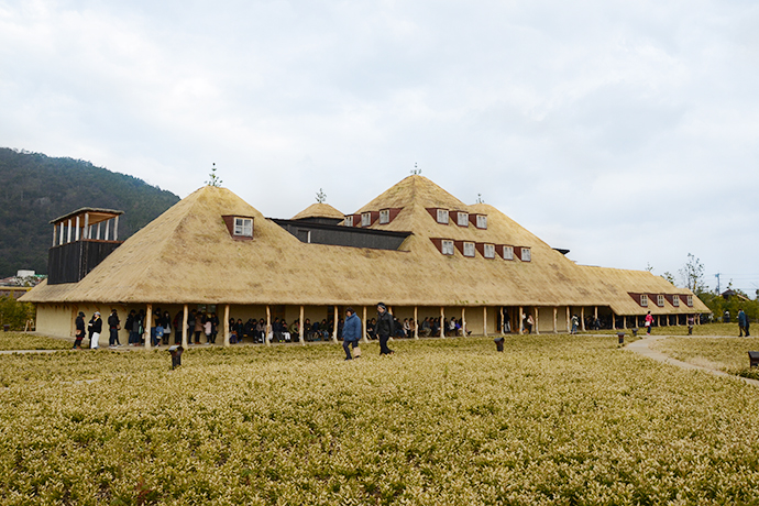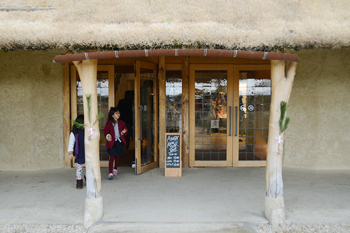 グリーンからすっかり冬の枯れ草色となった芝屋根のメインショップには、根洗いの松(根引き松)を飾りお正月の装い。