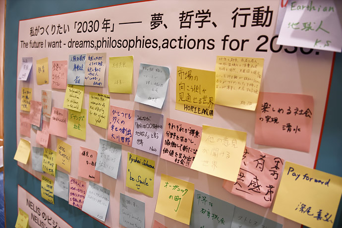 また、会場のみなさんは、その都度、感じたことや思いをどんどんポストイットに書き出しました。パネル一面に貼られた一枚一枚が大きなNELISの輪につながっていくのでしょう。