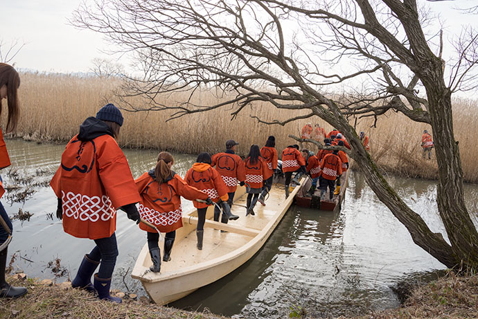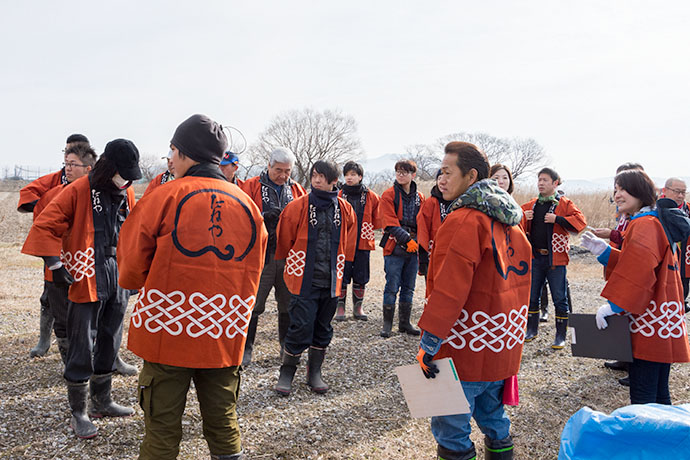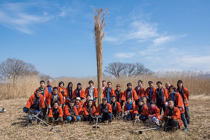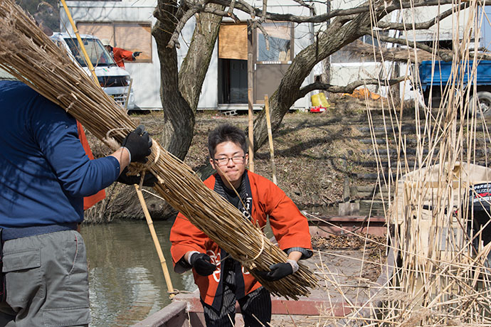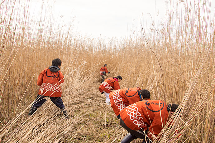 皆でお揃いの法被を羽織ってヨシを刈る人、ヨシをまとめる人、運ぶ人、そして午後から丸立てを作る人とチーム分けをして準備にかかります。
