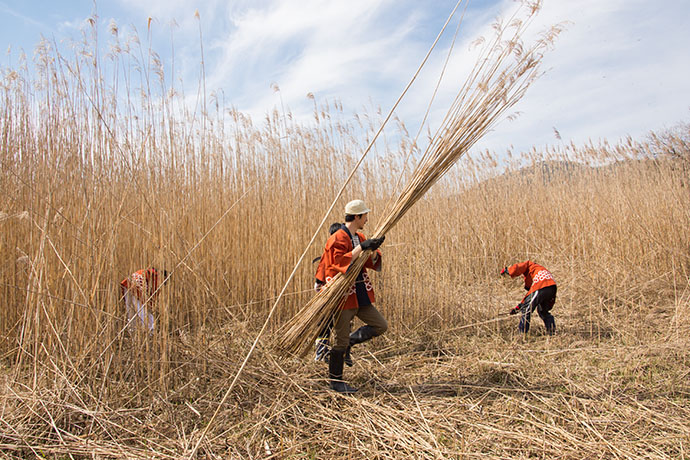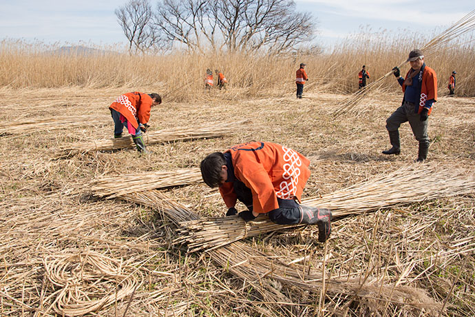 集まったヨシをまとめ、適度な太さになったら1つに束ねていきます。