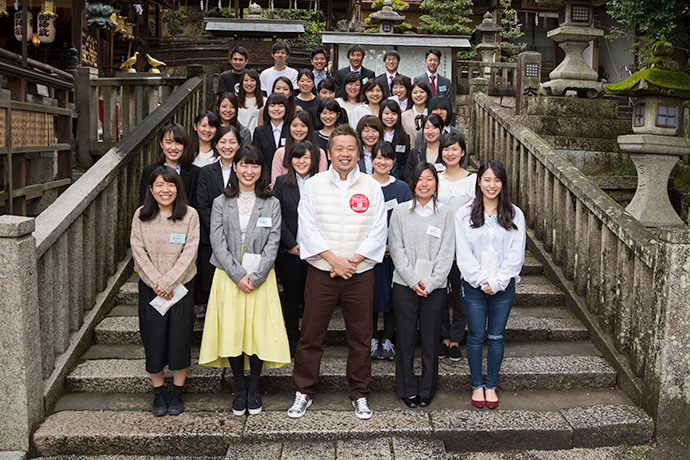 朝、新入社員たちはたねやグループのふるさと近江八幡の日牟禮ヴィレッジに集合しました。 たねやグループの会長・女将とともに日牟禮八幡宮を参拝し、ご祈祷いただきました。