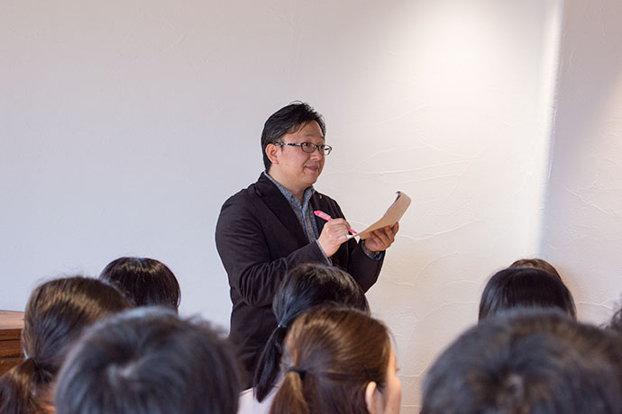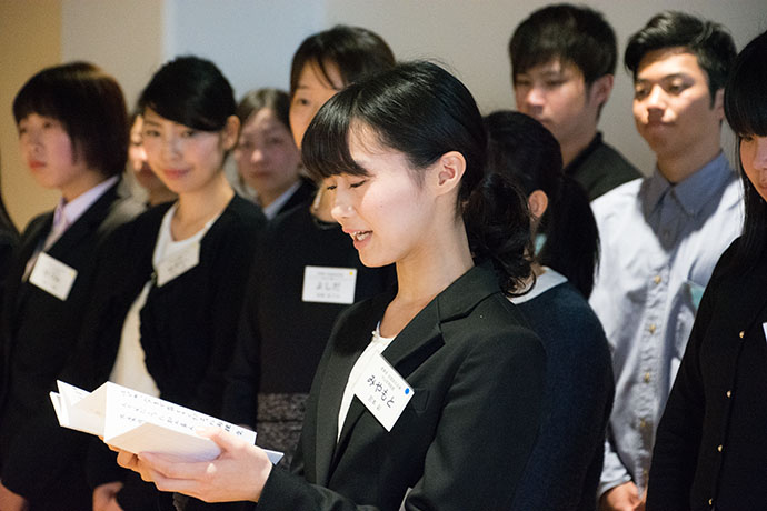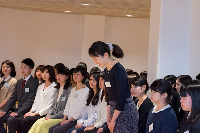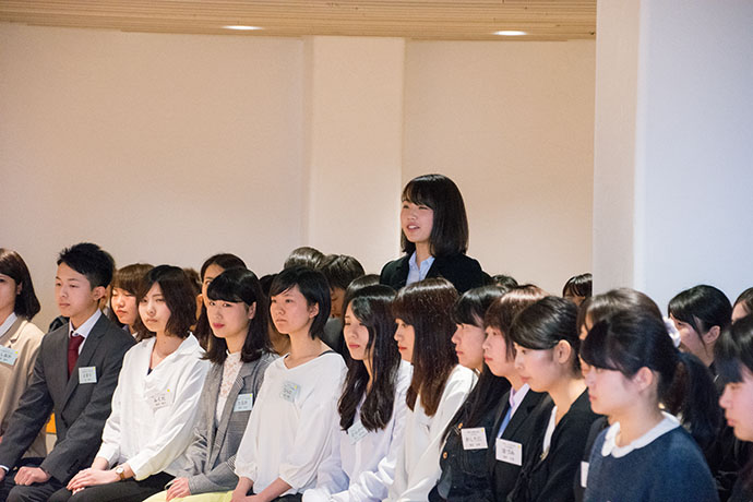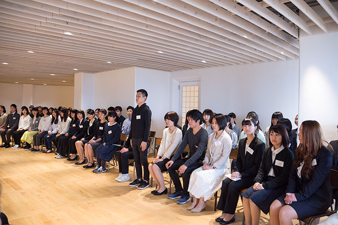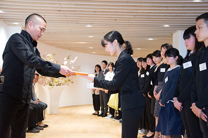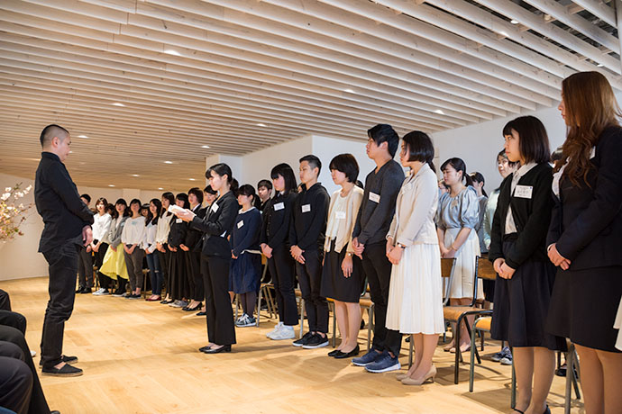 新入社員から「誓いの言葉」があり、CEOからお菓子とたねやグループのバイブル「末廣正統苑(すえひろしょうとうえん)」が手渡されました。