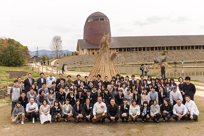 入社式が終わり、ラ コリーナ近江八幡で本社をバックに記念撮影。