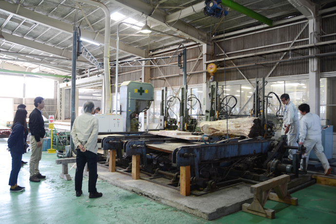 大きな機械でスライスされてゆく栗の木。ラ コリーナでは柱だけでなく、机やベンチといったあらゆるところに栗材が使われています。