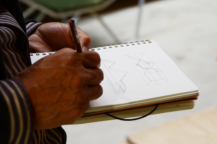 後日、末永製作所からラ コリーナに運ばれてきた栗の木。先生は早速スケッチを始めました。よく見ると、見慣れた芝屋根の、あの建物のようにも!
