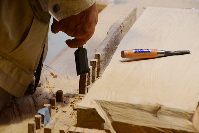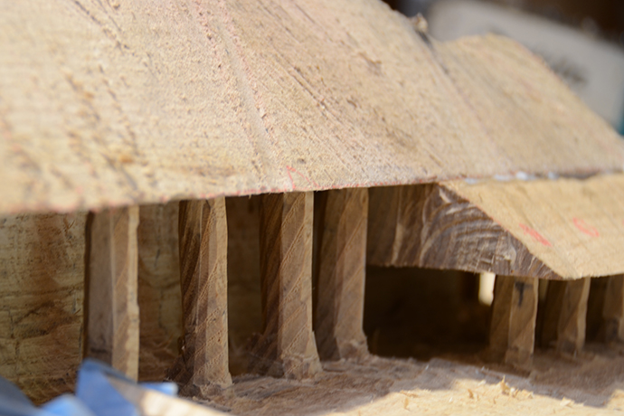 〈草屋根〉のなかでも特に印象的なピロティは、柱の一本一本をのみで削り出してゆきます。