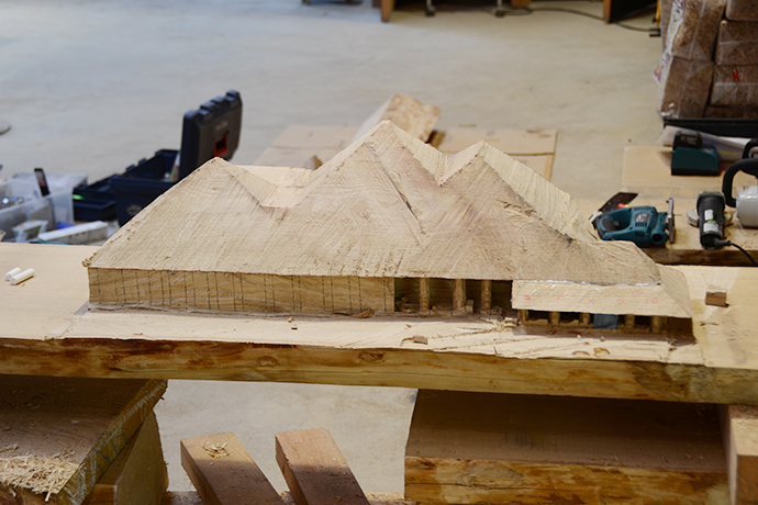 そうです!藤森先生がつくるのはメインショップ〈草屋根〉の模型。木に直接下書きをし、おおまかな部分を大工さんに切ってもらうと、ご自身もチェーンソーを手に次々と形を削り出してゆきます。