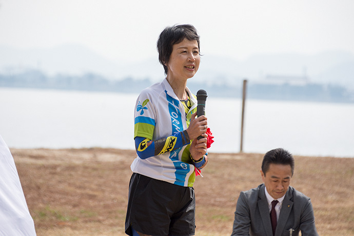 また、記念ライドに参加する池永滋賀県副知事やビワイチをサポートする自転車メーカー ジャイアントジャパンの中村社長からも、ビワイチが観光や健康づくりの目玉として県内をはじめ国内外のサイクリストが訪れる聖地となるよう期待をこめた挨拶がつづきました。