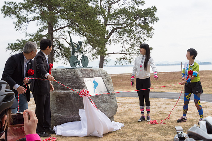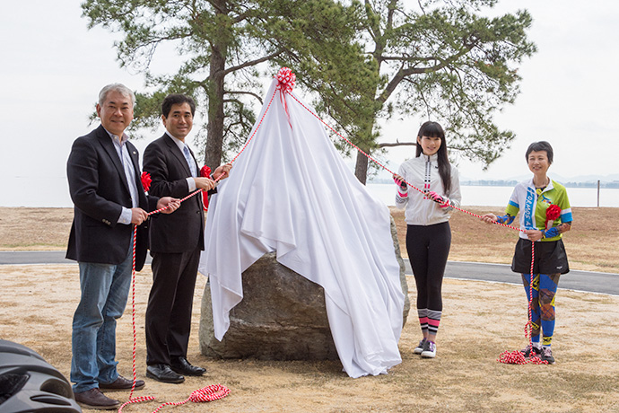 「見るまで信じられない思いで今日きました。この記念碑像を見て希望に満ちた未来がここから始まるイメージを受けました。これからビワイチが世界に向けてサイクリストの方だけでなく、興味を持っている方や健康を考える方が自転車を始めるきっかけになれるようサイクリング振興に協力していきたい」と語っていました。