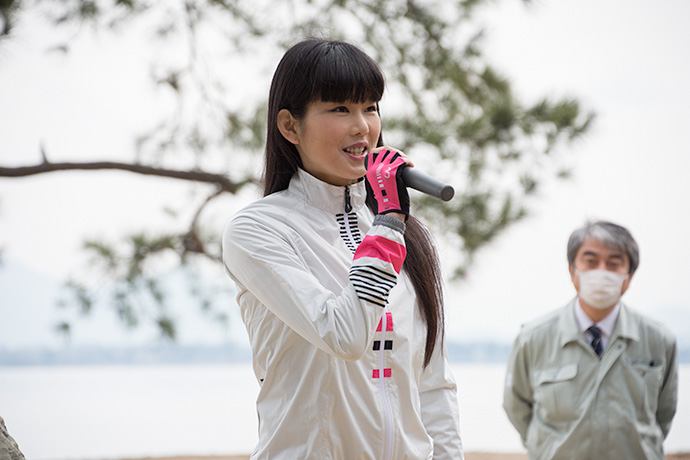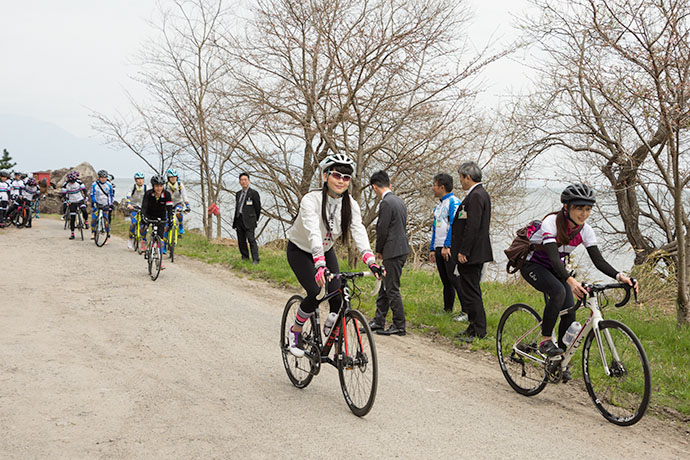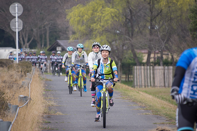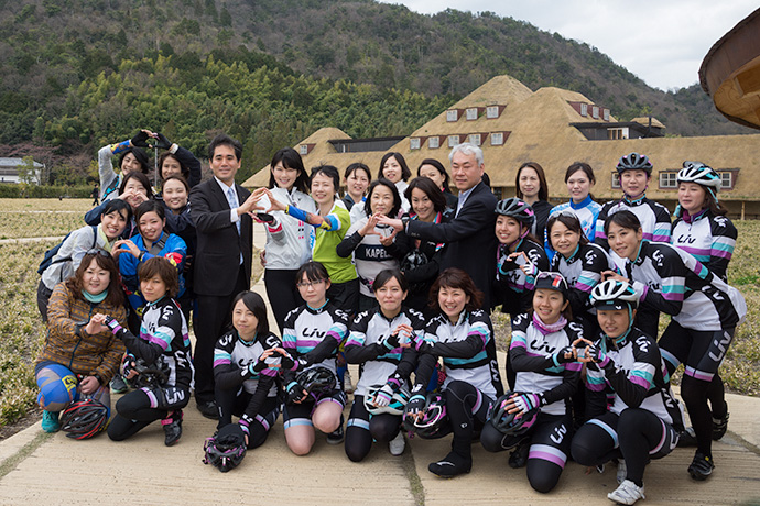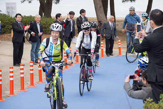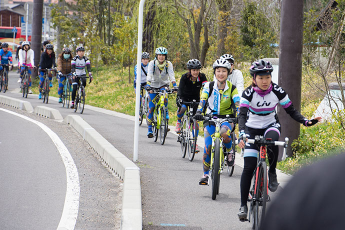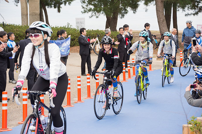 記念ライドは池永副知事を先頭に田中セシルさんやジャイアントの女性用バイクブランド「Liv」のスタッフなどが続きます。