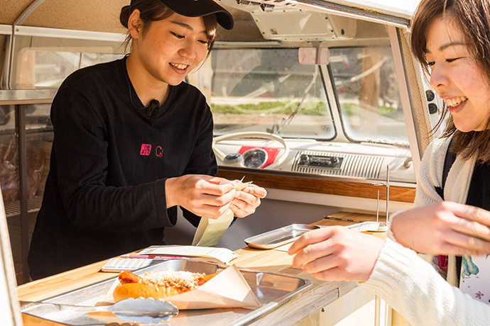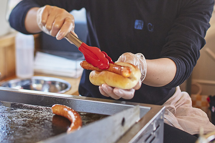 そんな春の足音が聞こえてくるのと同じ頃、パンショップの隣に「ホットドッグ」が新登場しました!赤いワーゲンバスと手書きの看板が目印です。