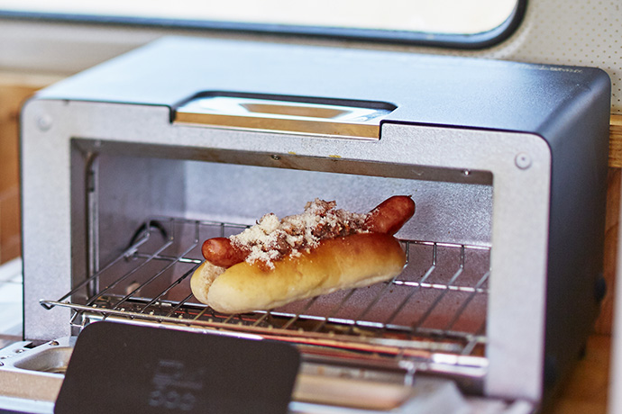 そこへソーセージと野菜の甘みが引き立つミートソースを挟み、セミドライトマトやパン粉、エダムチーズを乗せてトースターで焼き上げます。
